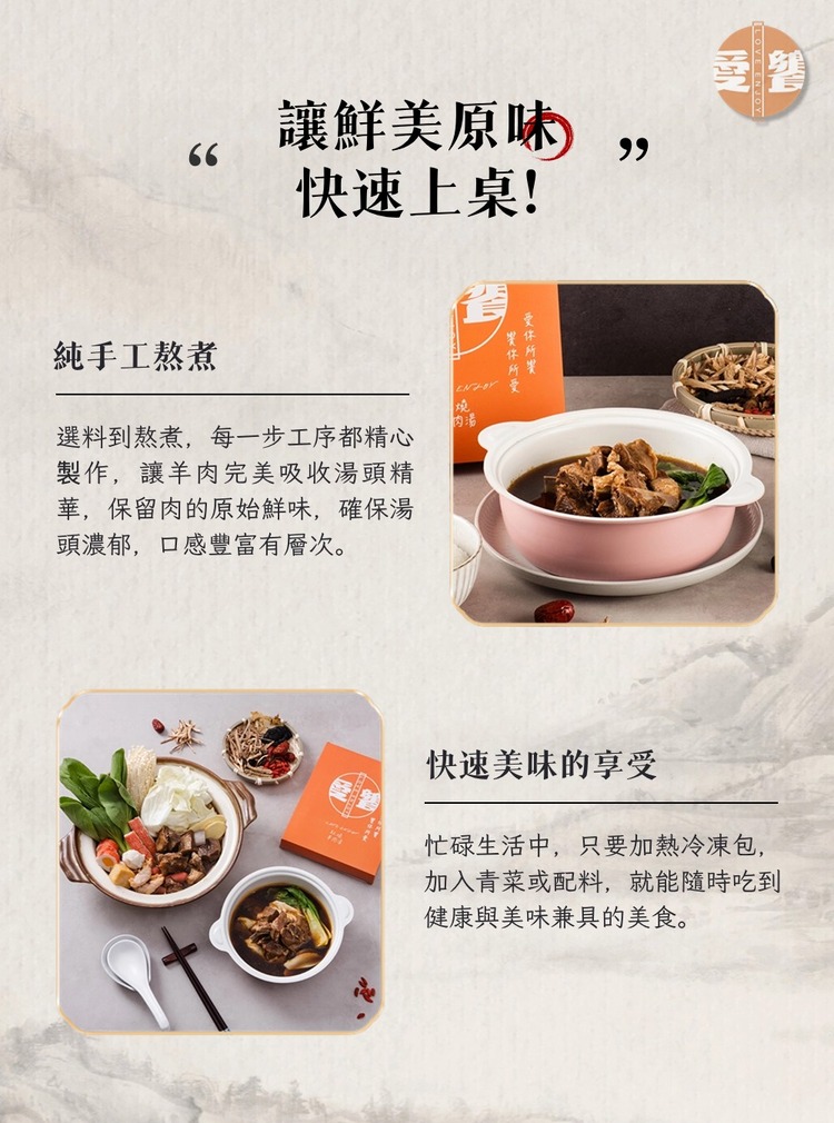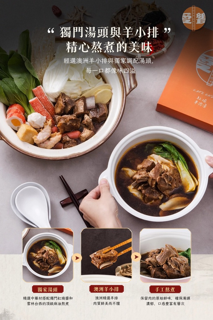 首頁 全部商品 【愛饗】紅燒羊肉湯(450g±3%/入) 🔍 【愛饗】紅燒羊肉湯(450g±3%/入)NT$230 獨家中藥紅燒湯頭:由老師傅研發,結合雲林台西頂級麻油與獨門紅燒醬,風味濃郁。 純手工熬煮:每道工序都精心處理,羊肉完美吸收湯底精華,口感豐富。 澳洲頂級羊排:每份有6~7塊羊排,細膩彈性,肉質鮮美不膻,味道濃郁。 快速美味:簡易加熱,即可享用健康美味。 健康品質保障:無添加防腐劑,SGS認證,提供產品責任險。 【愛饗】紅燒羊肉湯(450g±3%/入) 數量 加入購物車 分類: 全部商品, 熱銷商品, 美食禮品 描述 額外資訊 商品描述 商品規格 成分:澳洲頂級羊排、當歸、八角、米酒、薑片、麻油、桂枝、黃耆、川芎、紅棗淨重:450g±3%/入內容物:羊肉湯(含約6~7塊羊肉)保存期限:冷凍保存3個月(未開封)產地:台灣出貨方式:冷凍出貨。注意事項:離開冷凍狀態超過2小時請儘速食用。 重量 0.06 公斤 相關商品 【Aijia愛佳】 南瓜分離豌豆蛋白-隨身包(10包/盒) NT$990 原始價格:NT$990。NT$690目前價格:NT$690。 加入購物車 【初見小舖】果乾水禮盒(20包/盒) NT$990 加入購物車 【初見小舖】御品三味木質禮盒(蒜蓉醬/拌飯醬/麻辣醬)180ml NT$1,250 加入購物車 【初見小舖】素食辣椒醬 180ml NT$450 加入購物車