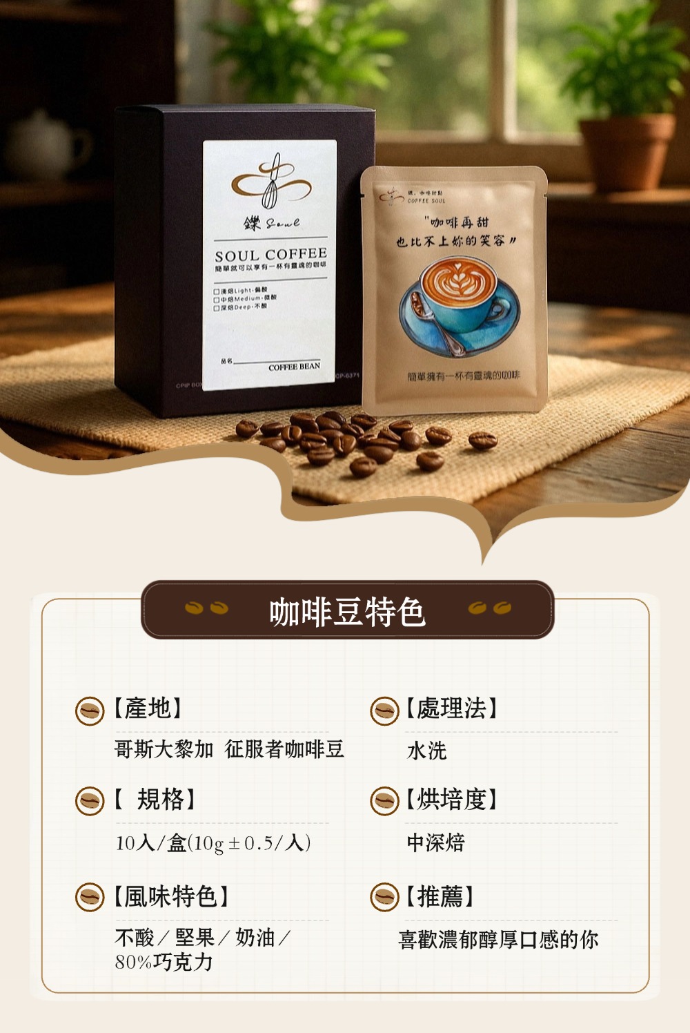 首頁 全部商品 【鑠咖啡・SOUL】哥斯大黎加征服者精品濾掛咖啡(10入/盒 水洗/中深焙/不酸) 🔍 【鑠咖啡・SOUL】哥斯大黎加征服者精品濾掛咖啡(10入/盒 水洗/中深焙/不酸)NT$550 原始價格:NT$550。NT$490目前價格:NT$490。 咖啡師嚴選,專業烘焙控管 可可堅果香,口感圓滑 茶感與堅果巧克力香氣 層次豐富,尾韻舒適 10 件庫存 【鑠咖啡・SOUL】哥斯大黎加征服者精品濾掛咖啡(10入/盒 水洗/中深焙/不酸) 數量 加入購物車 分類: 全部商品, 飲品禮品 描述 商品特色 商品規格 名稱:哥斯大黎加征服者 濾掛咖啡 風味特色:不酸/堅果/奶油/80%巧克力 處理法:水洗 烘焙度:中深焙 推薦:喜歡濃郁且順口風味的你 相關商品 【初見小舖】麻辣醬 180ml NT$450 加入購物車 【初見小舖】四喜辣醬禮盒 (蒜蓉辣椒醬/拌飯醬/麻辣醬/魔鬼辣椒醬) 45ml/瓶 NT$400 加入購物車 【初見小舖】鳳梨果醬 180ml NT$350 加入購物車 【初見小舖】拌飯辣椒醬 180ml NT$450 加入購物車