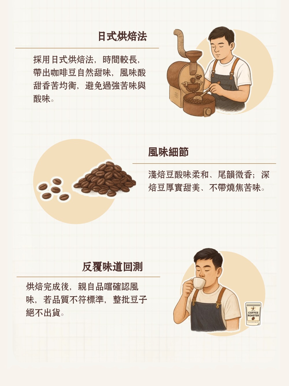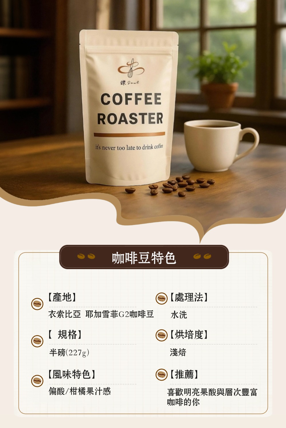 商品描述 商品規格 產地:衣索比亞 耶加雪菲 處理法:水洗處理,風味乾淨純淨 烘焙度:淺焙,酸質明亮,層次豐富 風味特色:帶有柑橘香氣與鮮明果汁感,口感清新活潑,尾韻柔和細膩 推薦族群:適合喜歡果酸細膩、層次清爽的咖啡愛好者 專業烘焙:每批豆子皆由 SCA 認證咖啡師嚴格控管,確保品質穩定與最佳風味