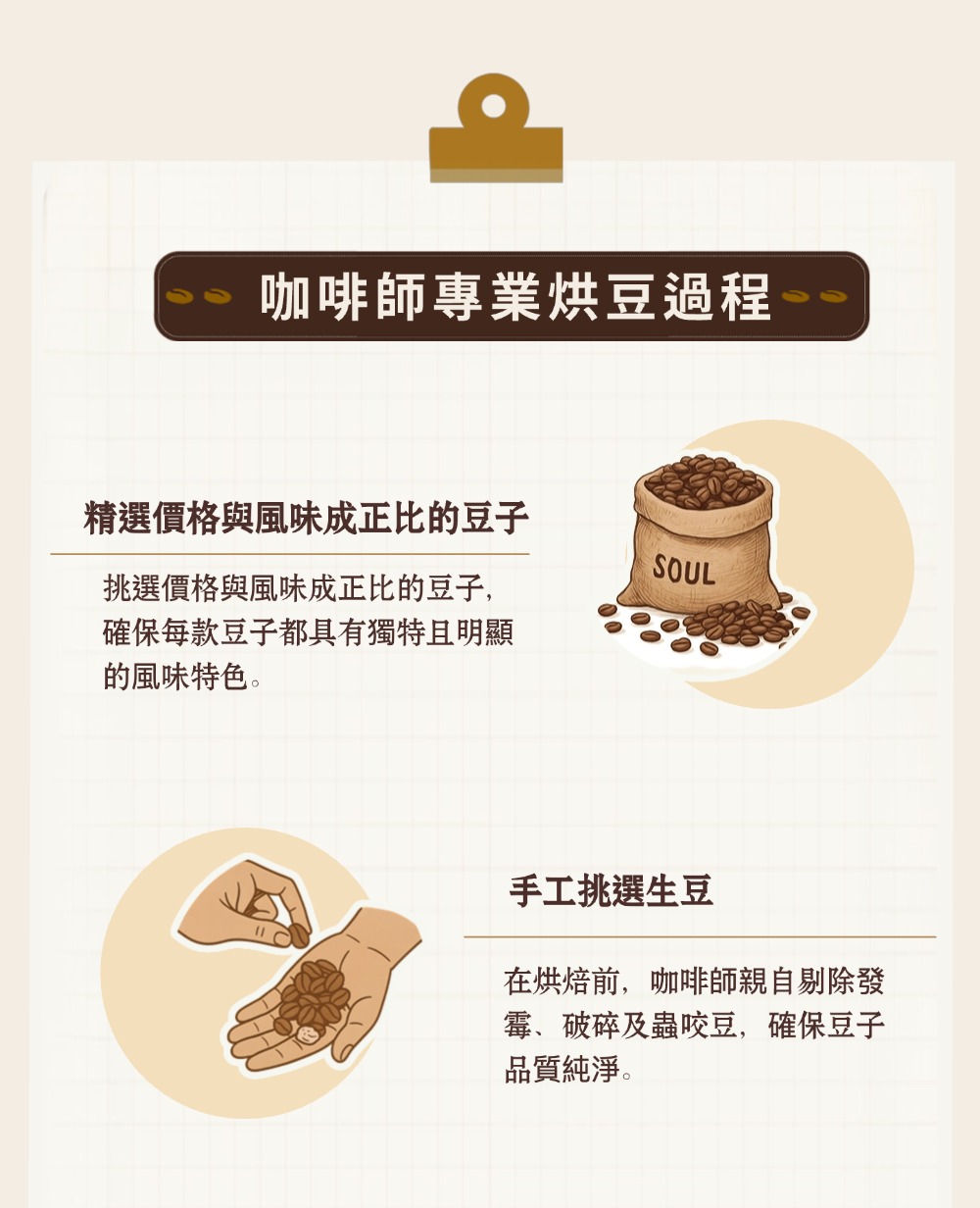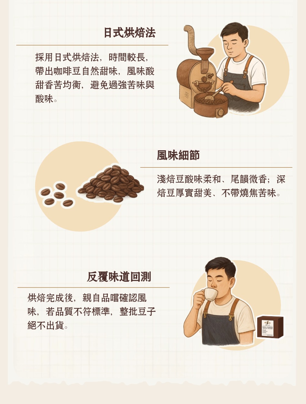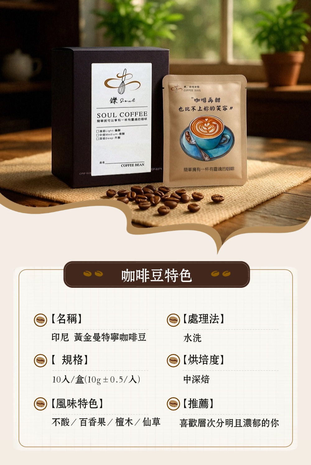 商品特色 商品規格 產地:印尼 處理法:水洗處理,風味乾淨純淨 烘焙度:中深焙,厚實醇香,苦甜平衡 風味特色:不酸,帶有百香果清新香氣,融合檀木沉穩韻味與仙草草本感 推薦族群:適合喜歡層次豐富、口感濃郁的你 專業烘焙:SCA 認證咖啡師,10年以上烘焙與教學經驗,嚴格控管品質 濾掛精品:便利即沖,完整呈現果香與草本調性,濃郁卻不失清爽